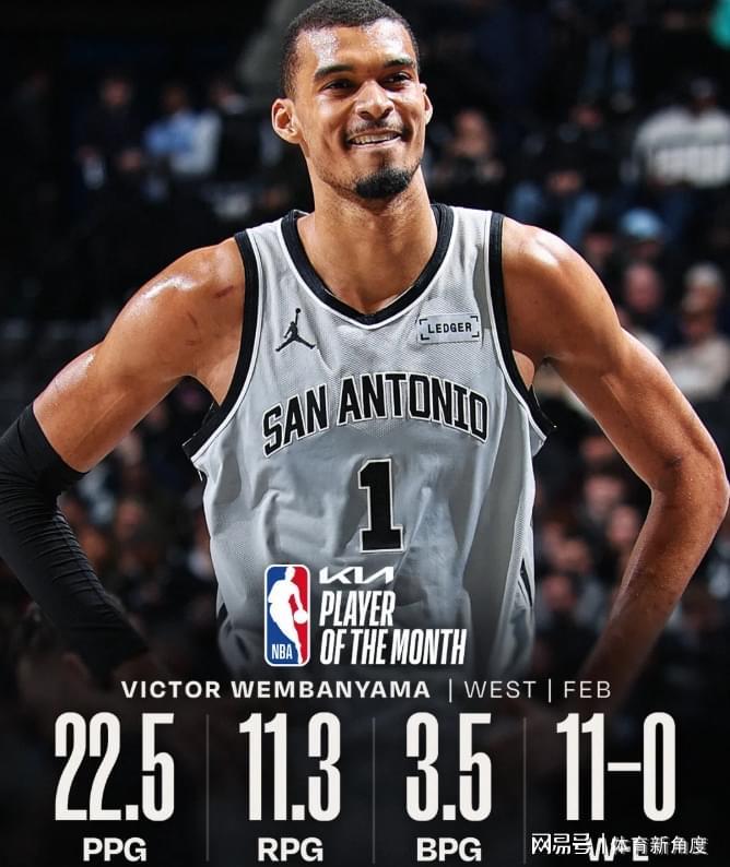 先来说说最佳球员,文班亚马在单月里场均能砍下22.5分,摘下11.3个篮板,还能送出3.5次盖帽,在他的助力下,球队取得了11胜0绩。这是文班亚马职业生涯中首次荣膺月最佳球员,相信有了这“第一次”的铺垫,未来他必将多次斩获此项荣誉。